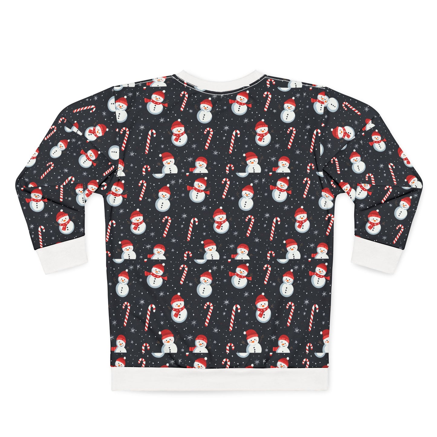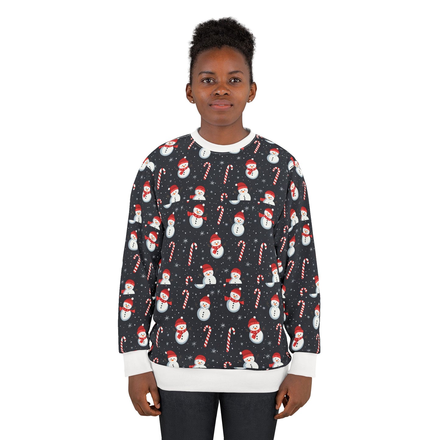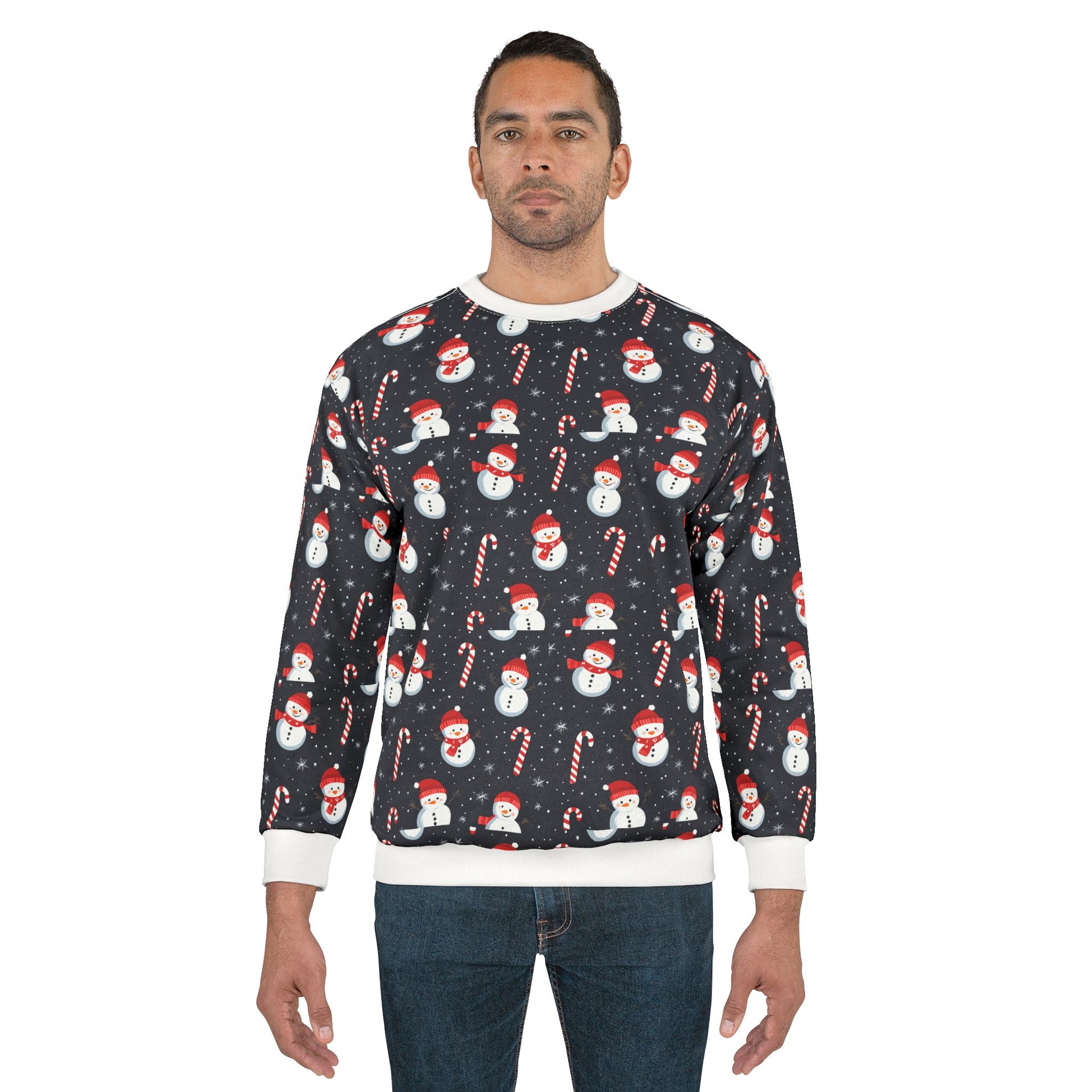 ay cozy and festive with this Snowman with cane Unisex Sweatshirt. The bright and intense colors of the all-over design give a joyful and whimsical vibe perfect for the holiday season. Made with durable 100% polyester fabric, ribbed-knit cuffs, and a classic fit, this sweatshirt is designed for comfort and style. Ideal for anyone looking to add a touch of Christmas spirit to their wardrobe or as a fun gift for friends and family.